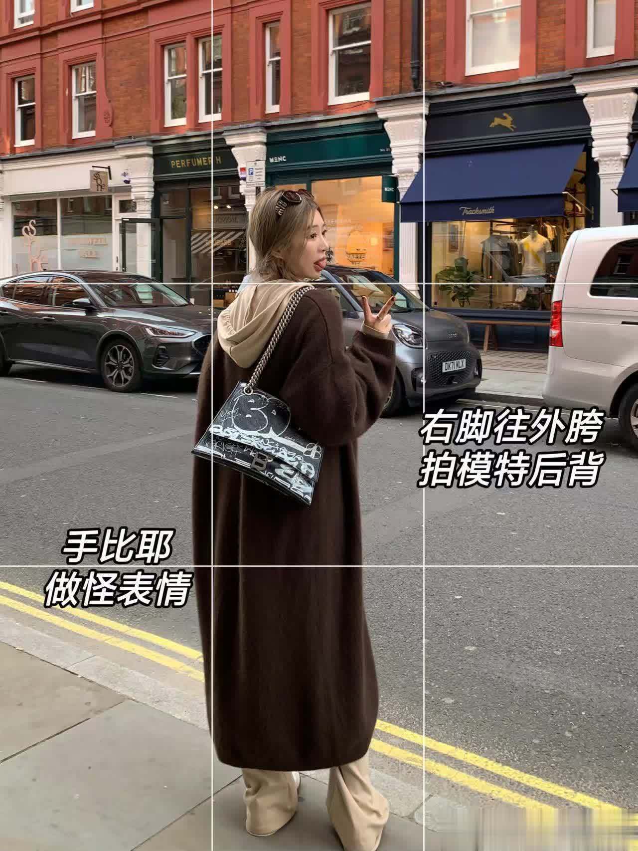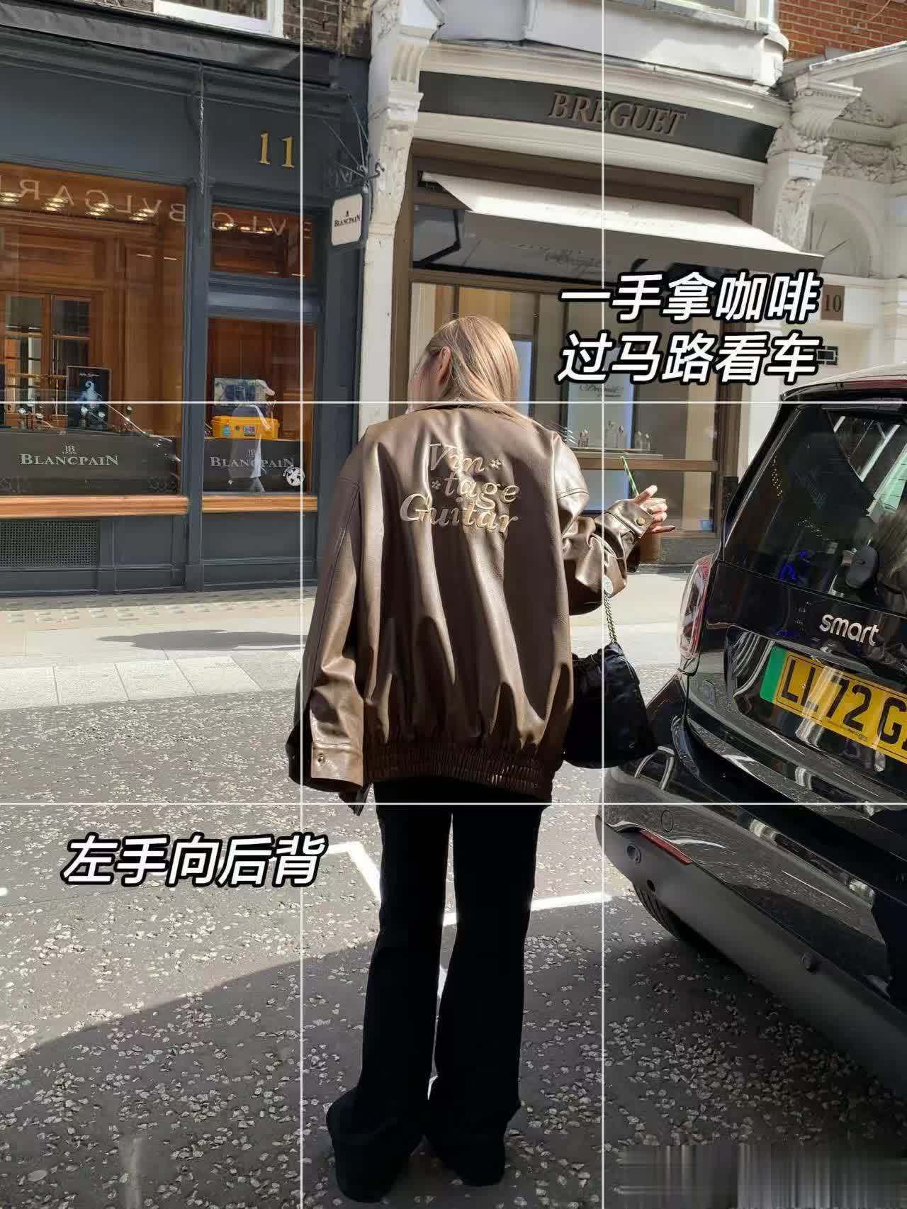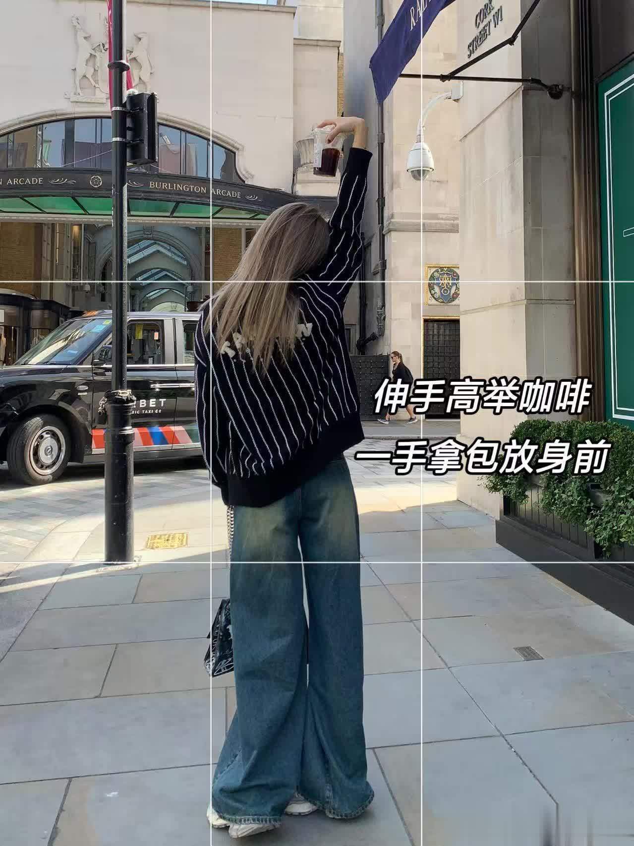 2、假装过马路,向四周探望,抓拍自然状态,可以将胳膊动作打开,比如说,抬起拿咖啡的手,向后甩的手。