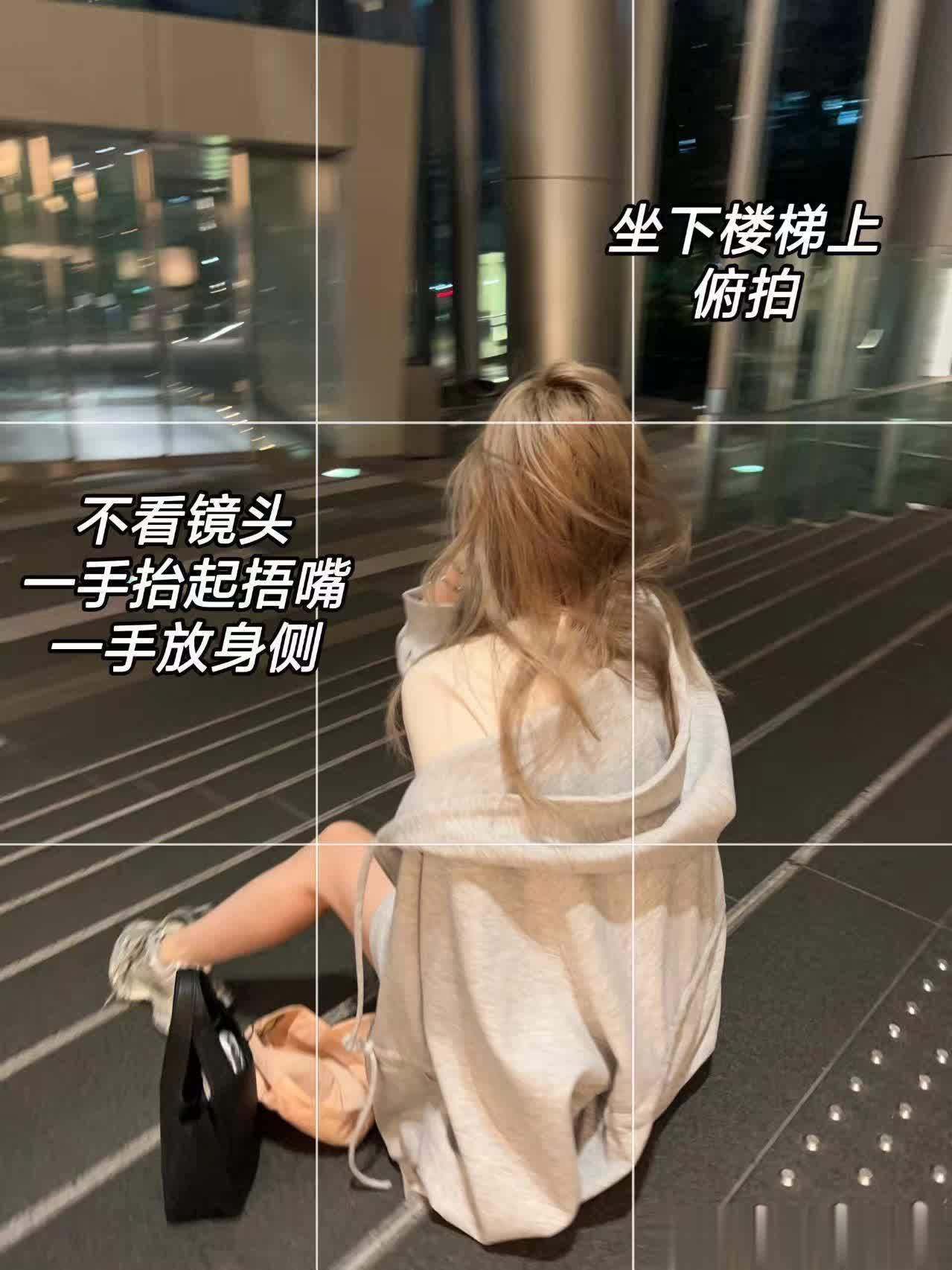 5、在楼梯的台阶上坐下,尽量将腿往前伸直,露出适当地肌肤,留给观众更多的想象空间。